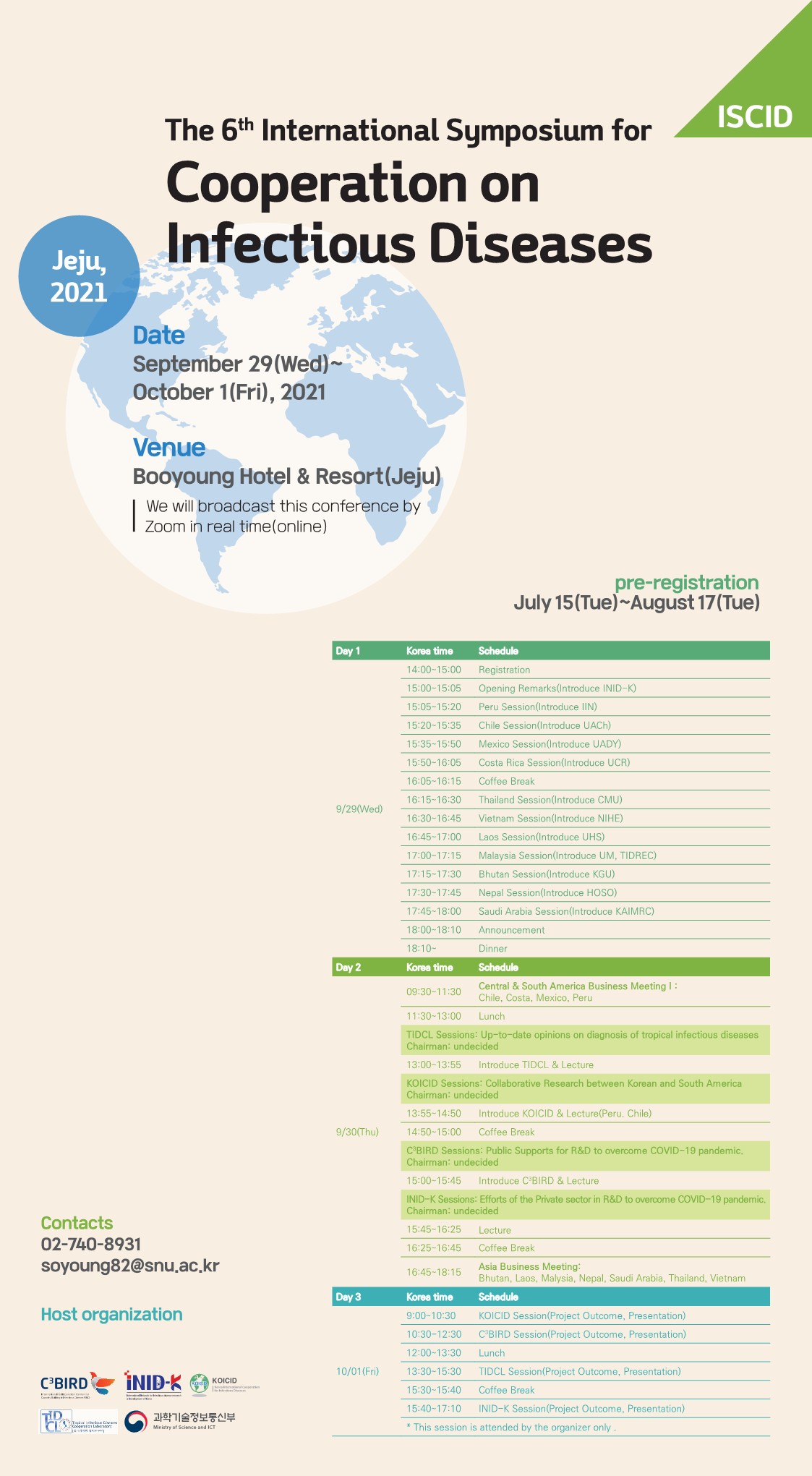 보건복지부의 감염병 예방 치료 기술개발사업 과제(KOICID: 충남대 김성민 교수)와 과학기술정보통신부의 감염병 국제 공동연구를 진행하고 있는 3개 과제(C3BIRD: 서울대 장인진 교수, INID-K: 서울대 이승환 교수(2세부: 화학연 김천생박사) TIDCL: 아주대 신호준 교수)가 온라인/오프라인 하이브리드 형태의 심포지엄을 공동으로 개최하고자 합니다. 많은 관심과 참석을 부탁드립니다. 1. 일시: 2021년 09월 29일(수)~10월 01일(금)